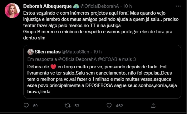 "Algo pesado. Lá dentro falei em processo e ela riu dizendo que nem ligava? era mais um pra conta mesmo com minha saída ela continua com ameaças. A brava tá aqui pra defender o grupo b de fora pra dentro. Eu tenho muito mais. E quem quiser expor vídeos (já tenho mais de 30 em arquivos do processo) coloca aí para todo mundo ver. Seremos resistência e não abandonaremos o grupo b que está indefeso lá dentro", escreveu.