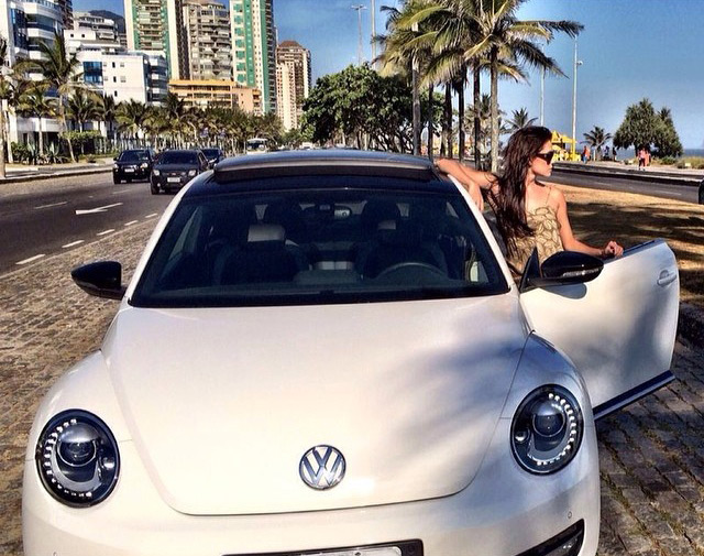 Por algum motivo, a atriz está fissurada no que aparenta ser seu veículo novinho em folha, um Volkswagen Novo Fusca.