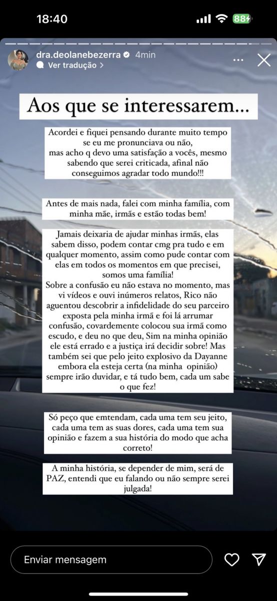 A advogada afirmou que Rico usou a irmã como escudo: “Não aguentou descobrir a infidelidade do seu parceiro e foi lá arrumar confusão covardemente”, e “sim, na minha opinião ele está errado e a Justiça irá decidir sobre”, afirmou Deolane no texto. Confira:
