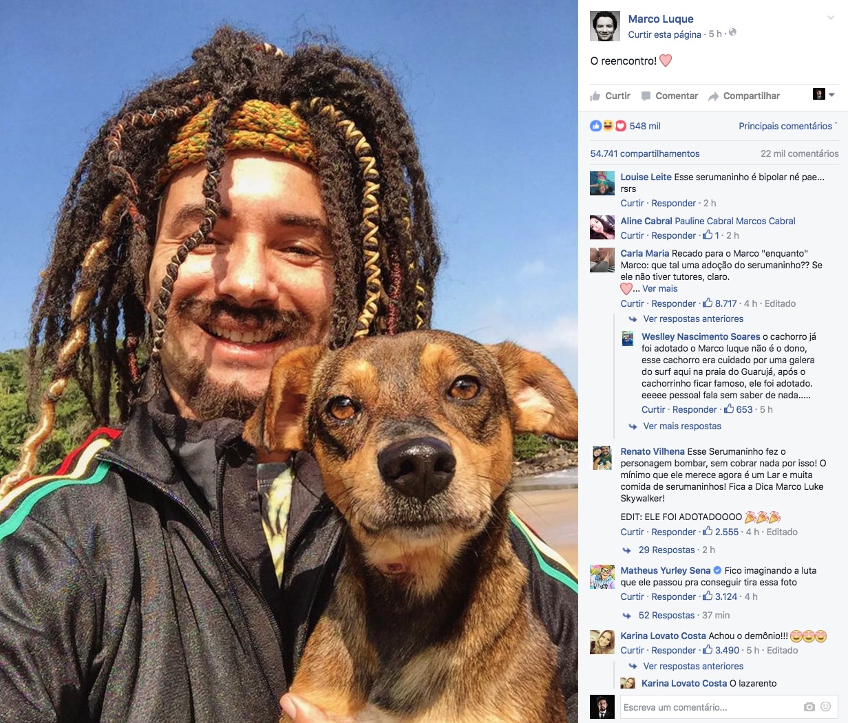 “Que tal uma adoção do serumaninho? “ sugeriu uma das seguidoras de Luque na torcida de que ele cuide do cãozinho de rua. “Esse Serumaninho fez o personagem bombar, sem cobrar nada por isso! O mínimo que ele merece agora é um Lar e muita comida de serumaninhos! Fica a Dica Marco Luke Skywalker!”, disse outro.