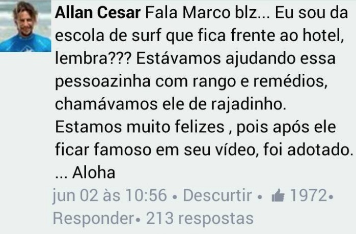 Mas uma excelente notícia: ele foi adotado! Enquanto ficava na praia o cachorrinho já era cuidado pela equipe de uma escola de surf que chamavam ele de “Rajadinho”. Depois do vídeo, confirmou um deles, o cachorrinho ficou famoso e foi adotado.