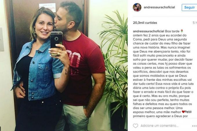 "Ontem fez 2 anos que eu acordei do Coma, pedi para Deus uma segunda chance de cuidar do meu filho de fazer uma nova história. Mas nunca imaginei que Deus me abençoaria tanto, não foi fácil sofri muito preconceito e ainda sofro por querer mudar, por decidir fazer as coisas certas, mas hj posso dizer que valeu a pena as lutas os sofrimentos os sacrifícios, descobri que nos desertos que somos moldados e que se Deus estiver à frente das minhas escolhas vai dar tudo certo! Essa nova vida é uma luta diária uma luta contra o próprio Eu pois fazer o errado e mais fácil do que fazer o que é certo. Mas eu oro muito, porque sei que não sou perfeita, tenho muitas falhas e defeitos mas eu quero todos os dias ser uma pessoa melhor”, reconheceu ela.