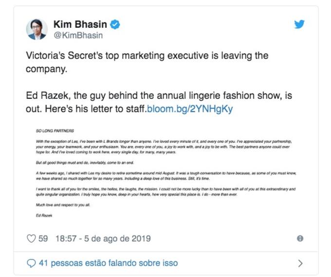 Na carta de despedida para os funcionários, Razek afirma que já havia dito à chefe-executiva da L Brands, Les Wexner, que queria se aposentar em meados de agosto. "Com exceção de Les, estou na L Brands há mais tempo do que qualquer um", disse.