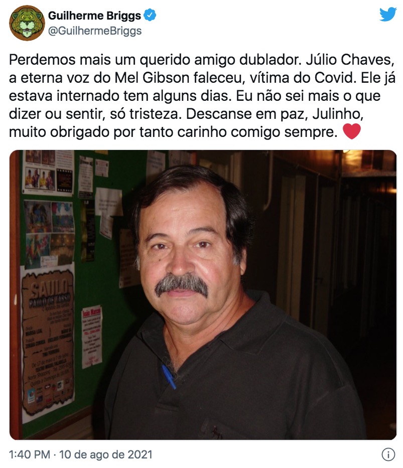“Perdemos mais um querido amigo dublador. Júlio Chaves, a eterna voz do Mel Gibson faleceu, vítima do Covid. Ele já estava internado tem alguns dias. Eu não sei mais o que dizer ou sentir, só tristeza. Descanse em paz, Julinho, muito obrigado por tanto carinho comigo sempre”, escreveu ele.