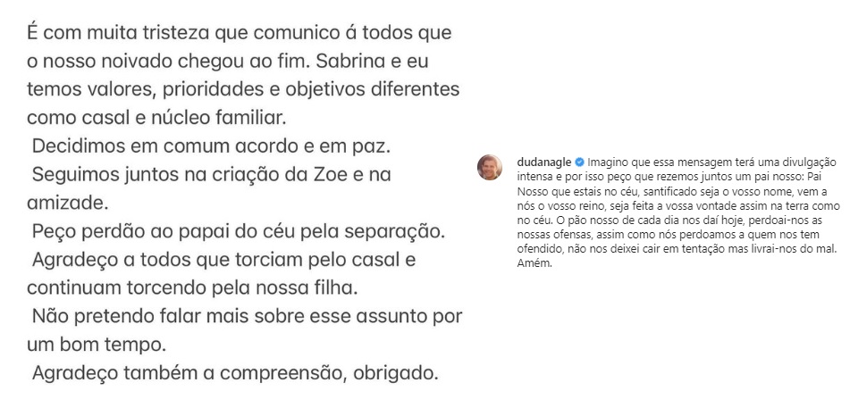 O ator afirmou que os dois têm valores, prioridades e objetivos diferentes como casal e núcleo familiar. Por isso, decidiram se separar em comum acordo e em paz. Duda pediu perdão a Deus pela separação e disse que pretende não falar mais sobre isso.
