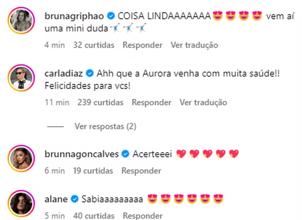 A revelação do sexo do bebê foi um ponto alto da celebração, e o nome da filha foi anunciado com grande alegria. Nos comentários da publicação, várias amigas famosas de Duda, incluindo Bruna Griphao, Brunna Gonçalves e Carla Diaz, deixaram mensagens de felicitações para a atriz, compartilhando a felicidade pelo novo capítulo que o casal está prestes a começar.