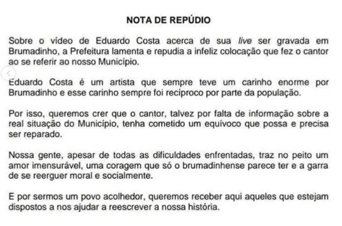 Eduardo Costa gerou revolta ao fazer comentários sobre a cidade de Brumadinho, no interior de Minas Gerais, que foi vítima da tragédia provocada pela Vale em 2019, que deixou 259 mortos em janeiro de 2019.