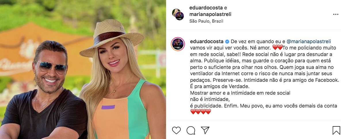 A novela de Mariana Polastreli, Eduardo Polastreli e Eduardo Costa continua. O ex-marido da empresária voltou a "colocar a boca no trombone" contra a ex, que segundo ele o deixou para ficar com o cantor. Nesta semana, o cantor publicou a primeira foto oficial do casal no feed do Instagram.