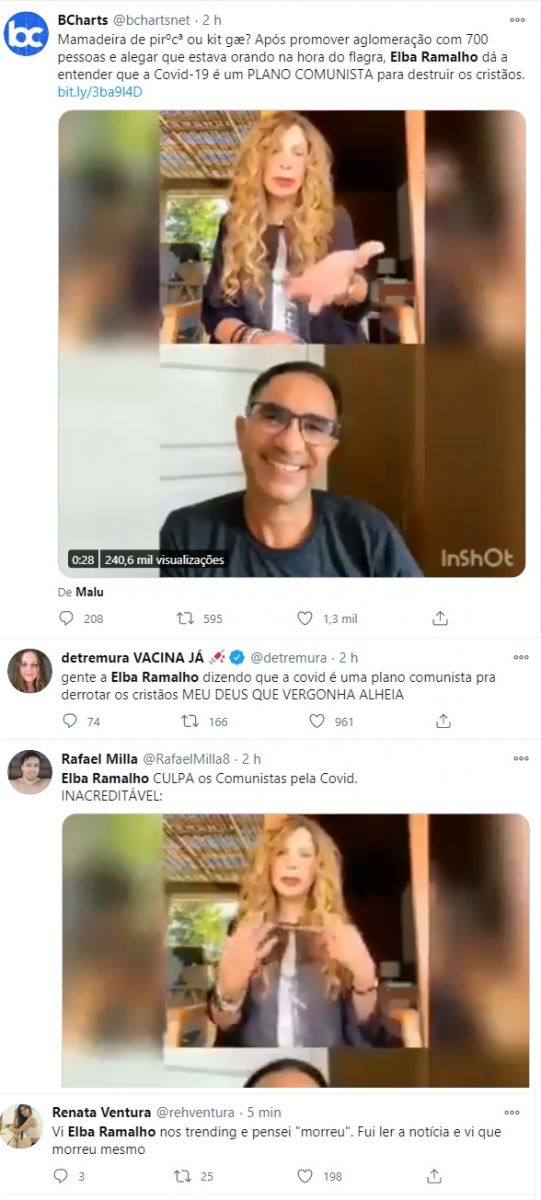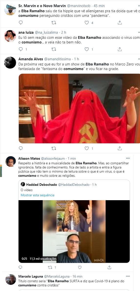 Elba Ramalho causou polêmica nesta terça-feira (5) com declarações conspiratórias nas redes sociais, sobre a Covid-19. A cantora de 69 anos diz que o vírus foi “criado pelos comunistas” para “destruir os cristãos”.