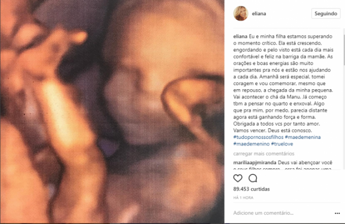"Eu e minha filha estamos superando o momento crítico. Ela está crescendo, engordando e pelo visto está cada dia mais confortável e feliz na barriga da mamãe. As orações e boas energias são muito importantes pra nós e estão nos ajudando a cada dia. Amanhã será especial, tomei coragem e vou comemorar, mesmo que em repouso, a chegada da minha pequena. Vai acontecer o chá da Manu. Já começo tbm a pensar no quarto e enxoval. Algo que pra mim, por medo, parecia distante agora está ganhando força e forma. Obrigada a todos vcs por tanto amor. Vamos vencer. Deus está conosco.", escreveu.