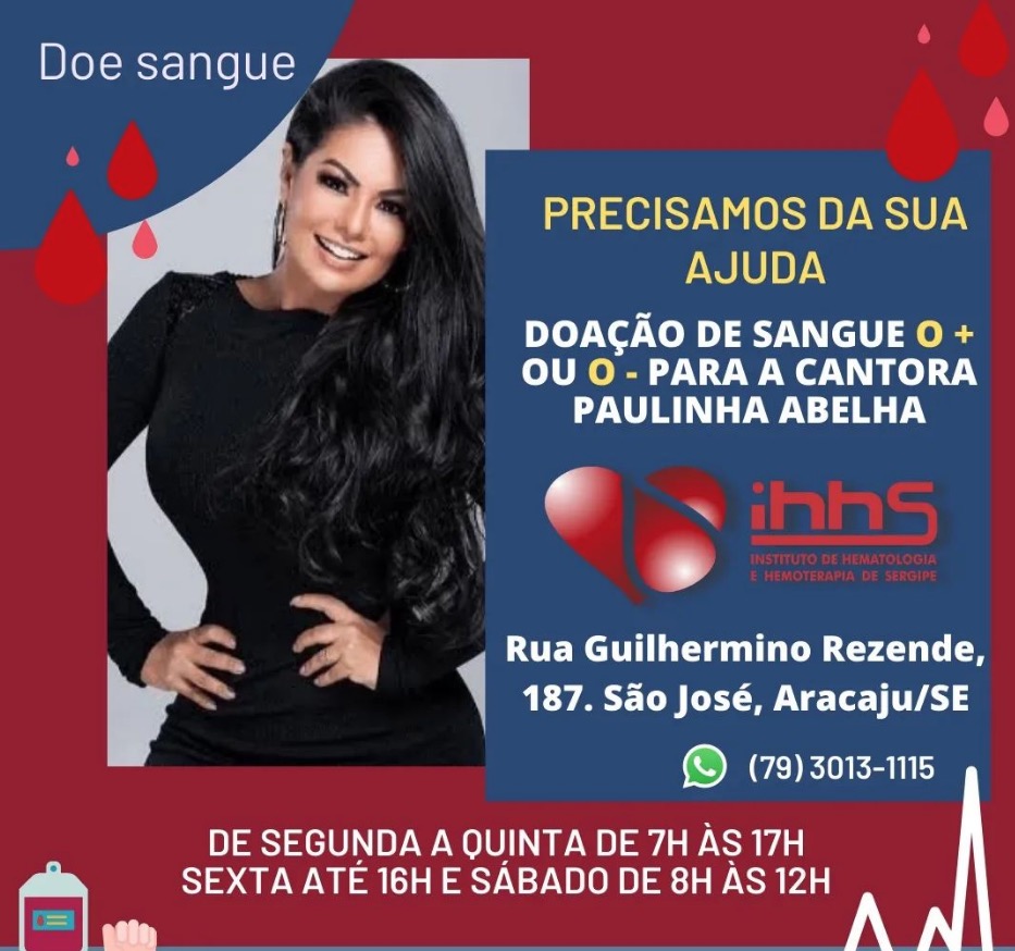 Paulinha precisa de doações de sangue do tipo O+ e O- e as doações podem ser feitas em quatro cidades: Aracaju, Lagarto, Italiana e Nossa Sra. do Socorro.