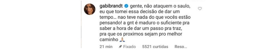 "Gente, não ataquem o Saulo, eu que tomei essa decisão de dar um tempo. Não teve nada do que vocês estão pensando! A gente é maduro o suficiente pra saber a hora de dar um passo pra trás, pra que os próximos sejam pro melhor caminho", escreveu a ex-De Férias com o Ex.