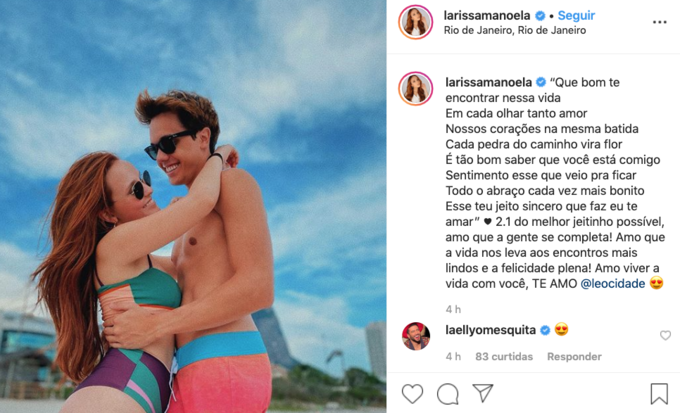 Larissa Manoela, 19, fez uma linda declaração para o namorado Leo Cidade, 23, com uma foto dos dois em na Praia da Barra da Tijuca, no Rio de Janeiro.
