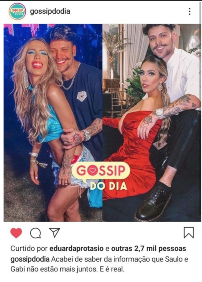 O relacionamento de Saulo Poncio com Gabi Brandt voltou a ser um dos assuntos mais comentados nas redes sociais e o nome do casal liderou o ranking dos topics trendings do twitter, durante a madrugada deste domingo (01), isso porque um perfil de fofocas do Instagram divulgou que o casamento dos pais do Davi teria chegado ao fim.