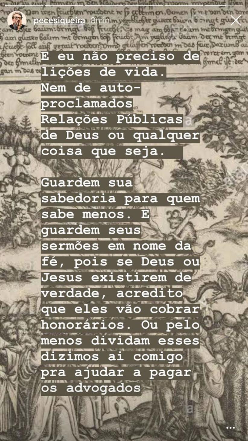 Guardem sua sabedoria para quem sabe menos. E guardem seus sermões em nome da fé, pois se Deus ou Jesus existirem de verdade, acredito que eles vão cobrar honorários. Ou pelo menos dividam esses dízimos aí comigo pra ajudar a pagar os advogados.