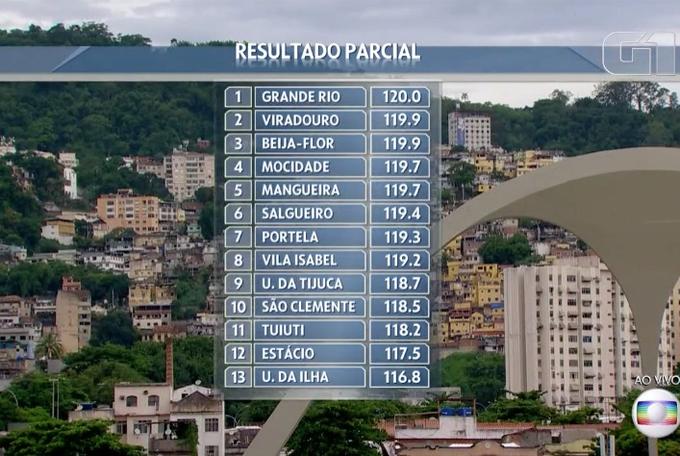 Após a leitura das notas de quatro dos nove quesitos, a Grande Rio lidera a apuração do Carnaval 2020 do Rio de Janeiro. Por enquanto, ela lidera com 120 pontos e ainda seguem na disputa a Beija-Flor e a Viradouro com apenas 0,1 décimo de diferença, ambas possuem 119,9 pontos.