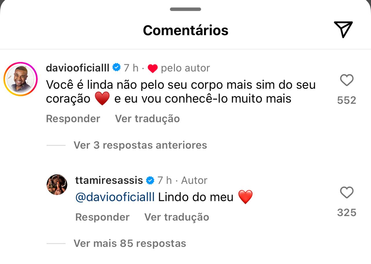 “Você é linda não pelo seu corpo, mas sim do seu coração e eu vou conhecê-lo muito mais.”, comentou na foto de Tamires, que retribuiu: “Lindo meu”, escreveu.
