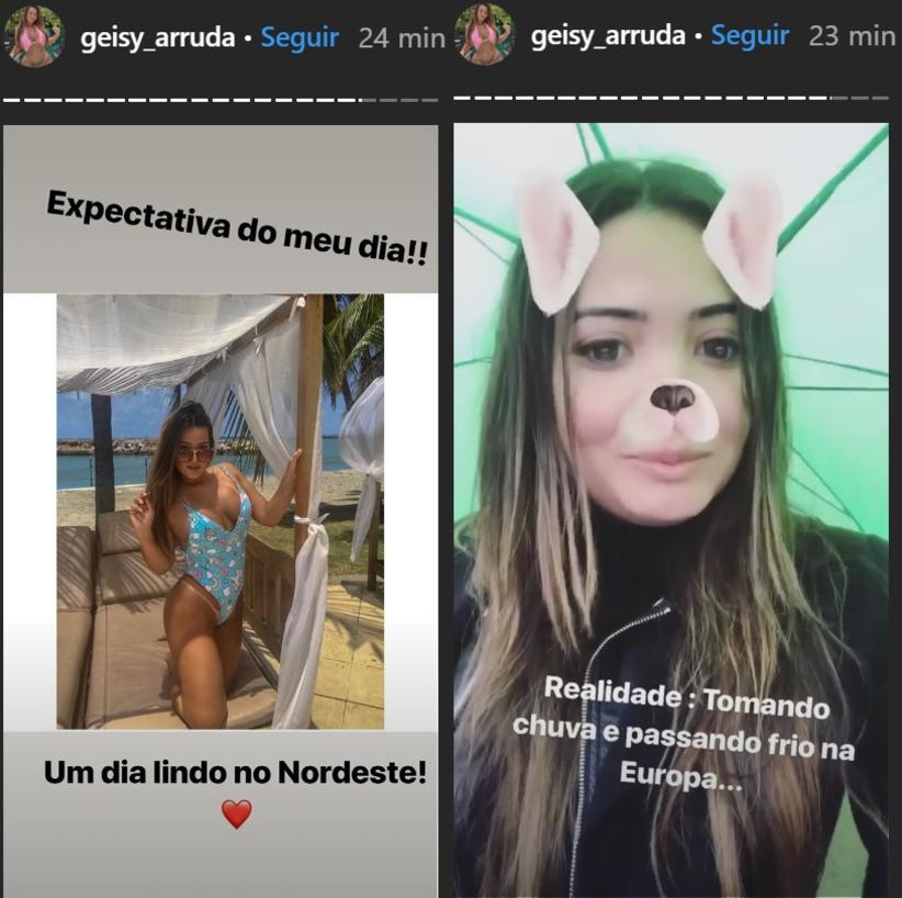 Nos Stories, a modelo tirou onda: "Expectativa do meu dia: um dia lindo no Nordeste", e "Realidade: Tomando chuva e passando frio na Europa".