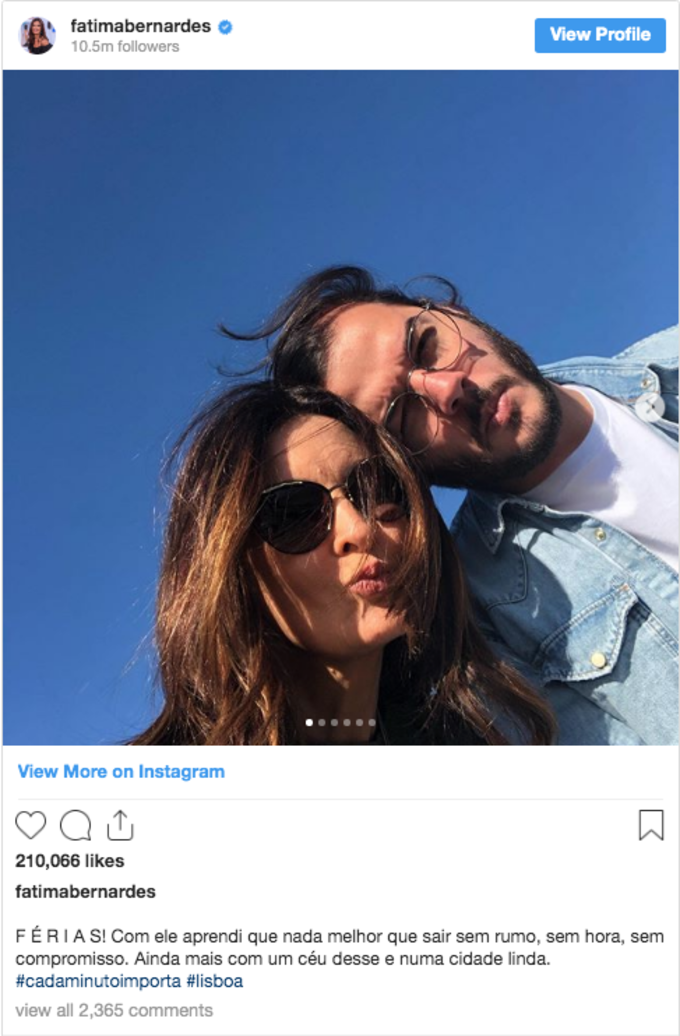 De acordo com UOL, a apresentadora postou fotos do casal neste domingo (29), em Lisboa e ainda se declarou ao amado na legenda. "Férias! Com ele aprendi que nada melhor que sair sem rumo, sem hora, sem compromisso. Ainda mais com um céu desse e numa cidade linda", escreveu Fátima.