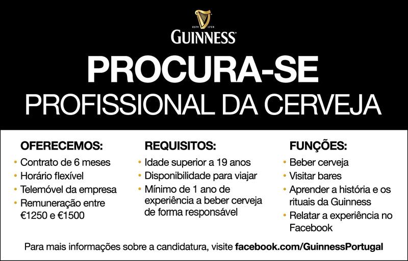 A cerveja Guinness está com processo seletivo para bebedor de cerveja em Portugal. O salário varia entre € 1.250 (R$ 3.227,25) e € 1.500 (R$ 3.872,70) em um contrato de seis meses. Todo o recrutamento está sendo feito pelo Facebook da empresa.