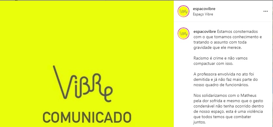 A mulher se trata de uma professora de ballet, que também foi desligada da Espaço Vibre. A empresa se disse “consternada” e "tratando o assunto com toda gravidade que ele merece". "Nos solidarizamos com o Matheus pela dor sofrida e mesmo que o gesto condenável não tenha ocorrido dentro de nosso espaço, esta é uma violência que todos temos que combater juntos", afirmou a empresa em nota.
