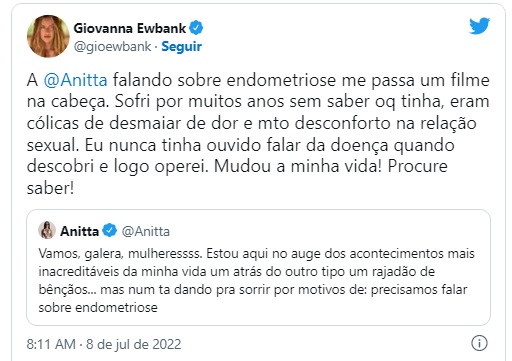 Giovanna Ewbank também se pronunciou sobre endometriose depois do relato de Anitta. A atriz já havia comentado o diagnóstico anteriormente nas redes sociais, mas reforçou a necessidade de se buscar informação sobre a doença.