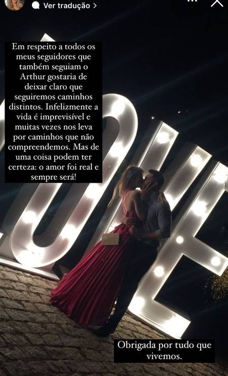 No Instagram, a enfermeira de 25 anos se pronunciou anunciando o término, deixando ainda uma declaração para o político: “Gostaria de deixar claro que seguiremos caminhos distintos. Infelizmente a vida é imprevisível e muitas vezes nos leva por caminhos que não compreendemos. Mas de uma coisa podem ter certeza: o amor foi real e sempre será. Obrigada por tudo que vivemos".