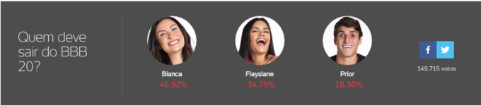 Após a formação do quinto paredão do BBB 20, em que Flayslane, Bianca e Prior disputam a preferência do público, o site UOL deu início a uma enquete para servir como base aos torcedores dos participantes.