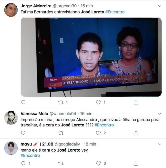 “José Loreto tá no Encontro”, comentou um. “Impressão minha , ou o moço Alessandro , que levou a filha na garupa para trabalhar, é a cara do José Loreto ??”, escreveu outra pessoa.