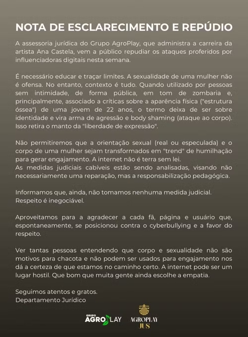 A equipe jurídica de Ana Castela divulgou uma nota nesta quarta-feira (17) para repudiar conteúdos que circularam nas redes sociais com especulações sobre a sexualidade da cantora e alertar que ataques e zombarias não são protegidos pela liberdade de expressão.