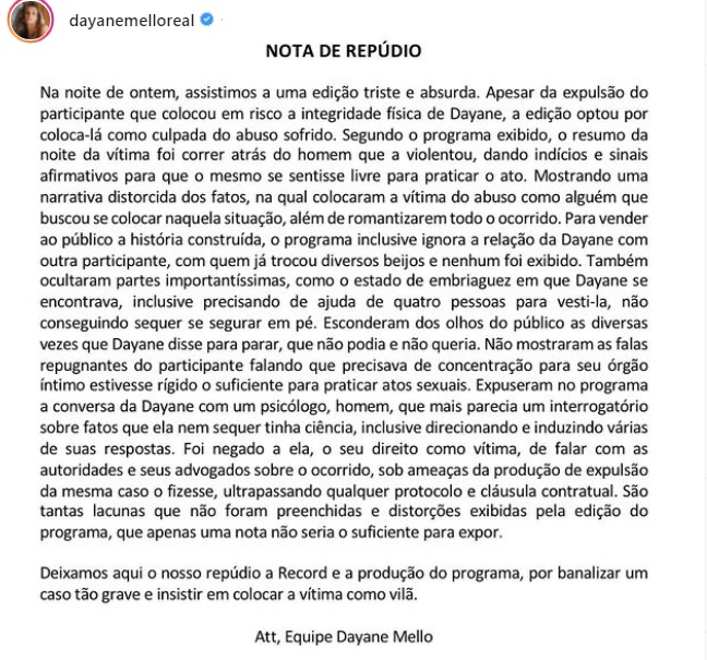 Na nota, a assessoria da ex-Big Brother Itália acusa a emissora de romantizar o ocorrido e exibir uma narrativa de que a vítima do abuso foi quem “foi atrás” do homem que a violentou, escondendo do público diversas vezes em que Dayane disse para Nego do Borel parar.