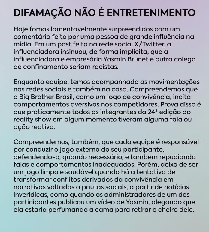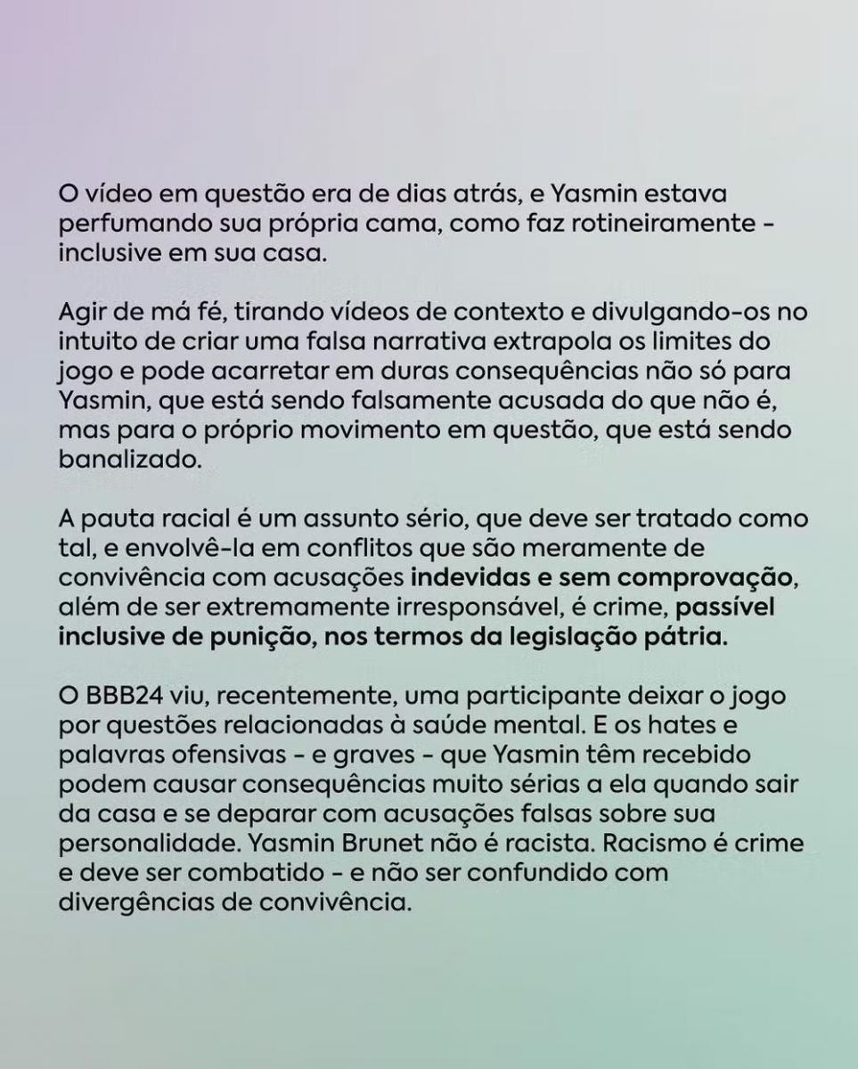 A equipe de Yasmin Brunet se manifestou nesta sexta-feira (26) após a modelo ser acusada de racismo, juntamente com Wanessa Camargo, por atitudes que as duas têm tomado contra Davi no BBB24.