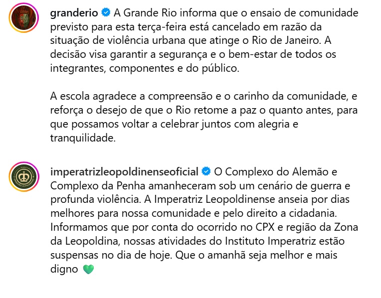 Grande Rio, Viradouro, Imperatriz Leopoldinense, Império Serrano e União da Ilha anunciaram o cancelamento dos ensaios, atendendo à recomendação da Prefeitura do Rio, que pediu aos moradores que evitem deslocamentos diante da insegurança e das interdições em várias regiões.