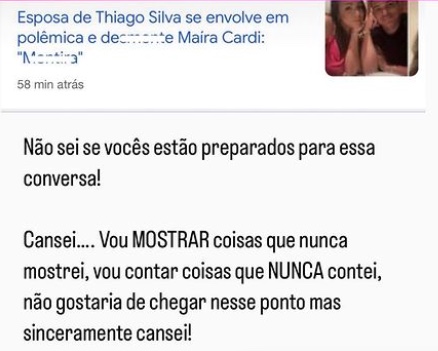 Maíra se revoltou e prometeu expor toda a situação. "Não sei se vocês estão preparados para essa conversa! Cansei… Vou MOSTRAR coisas que nunca mostrei, vou contar coisas que NUNCA contei, não gostaria de chegar nesse ponto mas sinceramente cansei!".