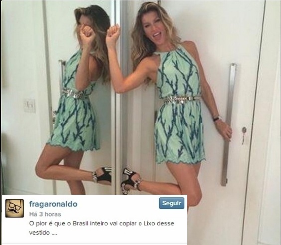 No Instagram, Ronaldo publicou a foto da top model e comentou "O pior é que o Brasil inteiro vai copiar o Lixo desse vestido", escreveu, e a maioria dos seguidores concordou com o estilista.