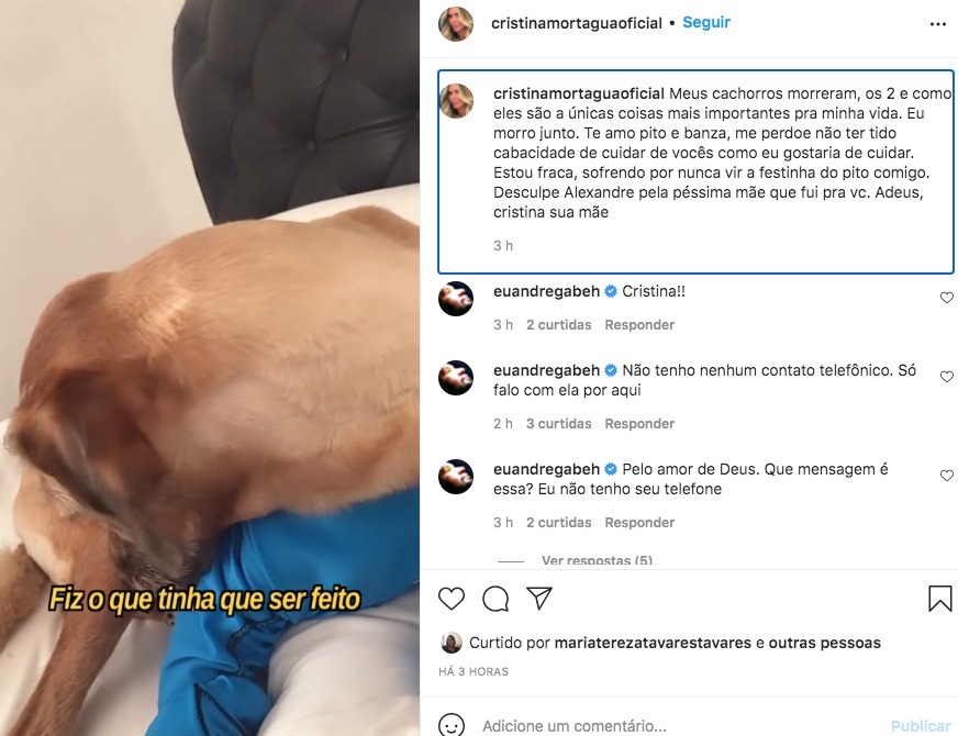 "Meus cachorros morreram, os 2 e como eles são a únicas coisas mais importantes pra minha vida. Eu morro junto. Te amo pito e banza, me perdoe não ter tido cabacidade de cuidar de vocês como eu gostaria de cuidar. Estou fraca, sofrendo por nunca vir a festinha do pito comigo. Desculpe Alexandre pela péssima mãe que fui pra vc. Adeus, cristina sua mãe", escreveu.
