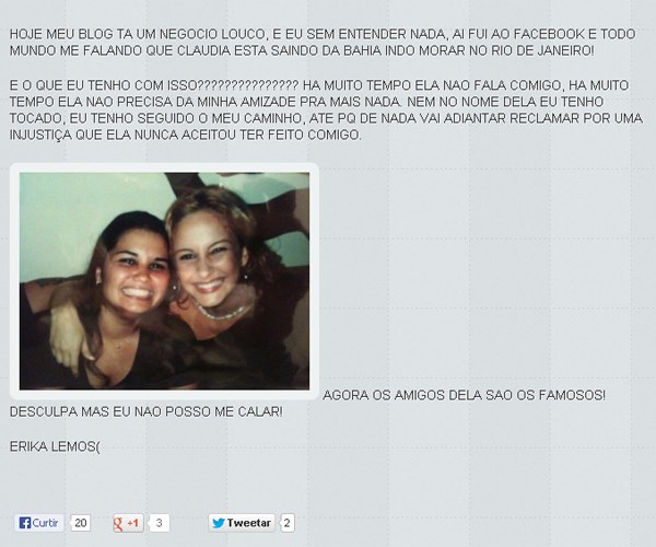 Parece que Claudia Leitte esqueceu da sua vida antes de se tornar celebridade. Amiga antiga e ex-assessora da cantora (que começou a cantar no Babado Novo) a blogueira Erika Lemos cansou de receber perguntas sobre a amizade e resolveu soltar o verbo na sua página na internet.