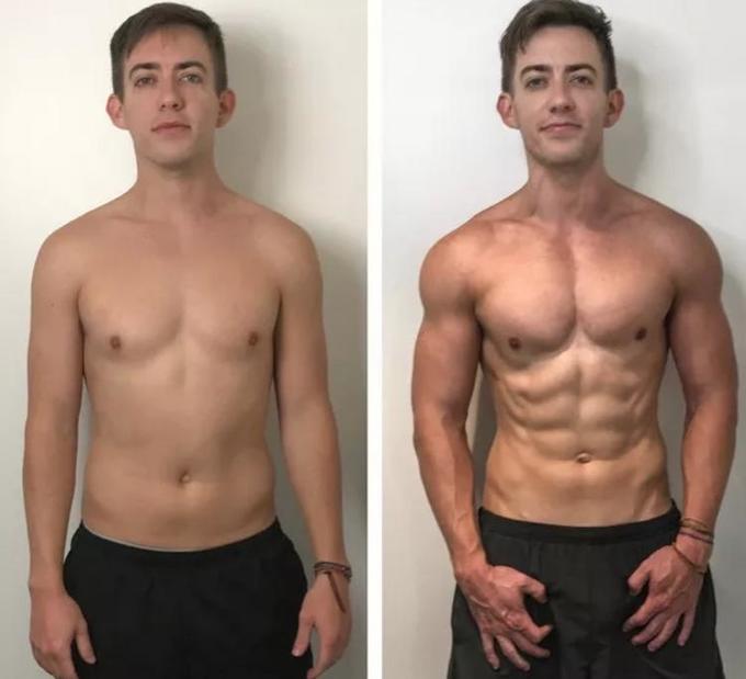 O ator aderiu a um programa fitness de 12 semanas e apareceu super musculoso. Kevin emagreceu apenas 3kg e eliminou 8,2 % de gordura. Agora ele está com 60kg.