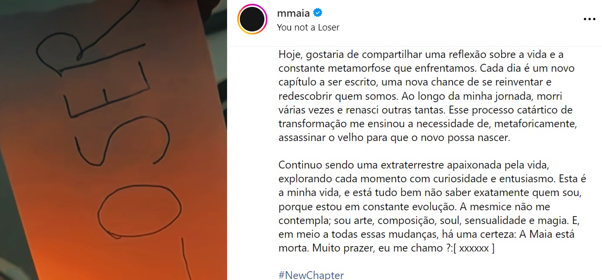 Ao que tudo indica, não passava de uma estratégia de Marcella para anunciar algum novo projeto --- que até agora, não foi explicado. No novo post, uma mão aparece queimando um papel escrito "looser" (perdedora, em inglês), com a legenda falando sobre "metamorfose" e que vai mudar de nome: "A Maia está morta. Muito prazer, eu me chamo :Ç [ xxxxx]", escreveu, deixando seguidores revoltados.