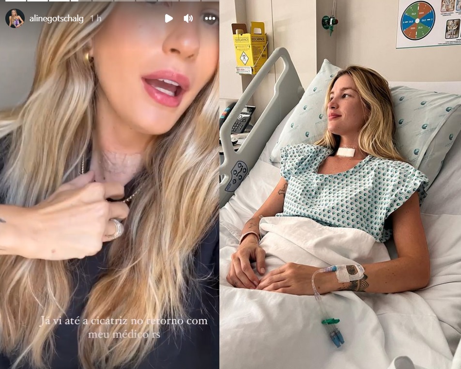 A ex-BBB Aline Gotschalg mostrou a cicatriz da retirada do tumor na na tireóide após ser diagnosticada com câncer na região. A influenciadora e esposa do ex-bbb Fernando Medeiros apareceu sorridente ao mostrar sua recuperação.