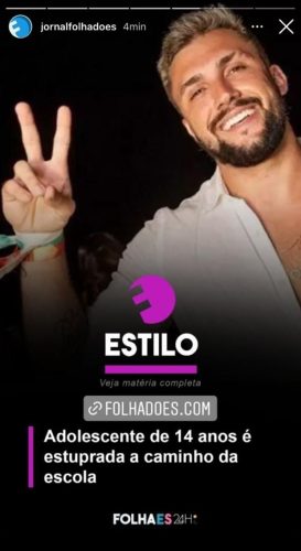 A situação aconteceu nos Stories do Instagram. A foto do ex-BBB foi publicada na notícia “Adolescente de 14 anos é estuprada a caminho da escola".