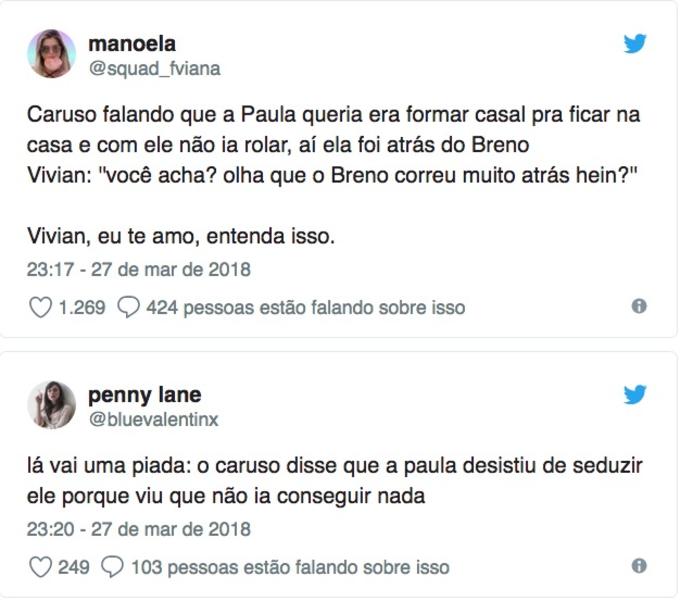 “Segundo Caruso a Paula só ficou com o Breno no final das contas porque ele não quis nada com ela”, disse outra.