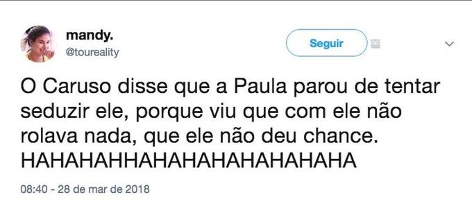Nas redes socais, muitos internautas zoaram o ex-bbb pela declaração. “lá vai uma piada: o Caruso disse que a Paula desistiu de seduzir ele porque viu que não ia conseguir nada”, brincou uma.