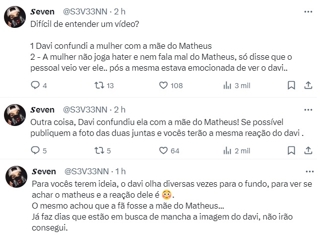 Enquanto alguns criticam Davi, outros saíram em defesa do ex-bbb afirmando que ele confundiu a fã com a mãe de Matteus.