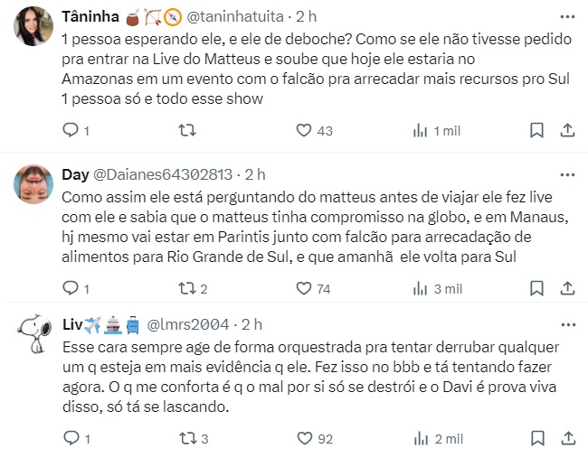 Nas redes sociais, o vídeo repercutiu e internautas acusam o campeão do BBB24 de querer “queimar” o amigo, já que todos sabem que Matteus está com Isabelle Nogueira em Manaus. Inclusive, alguns internautas também criticaram o gaúcho por se ausentar do Rio Grande do Sul em meio à catástrofe apesar dele estar engajado em arrecadar fundos para o estado.