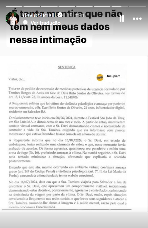 Mais cedo, passou a circular o print de uma suposta sentença. No texto, argumenta-se que Tamires foi ameaçada com uma arma durante uma videochamada com Davi, no dia anterior à sua viagem a Salvador - que como é de conhecimento público, acabou sendo desmarcada após o ex-BBB dar um "perdido" na moça, alegando febre.