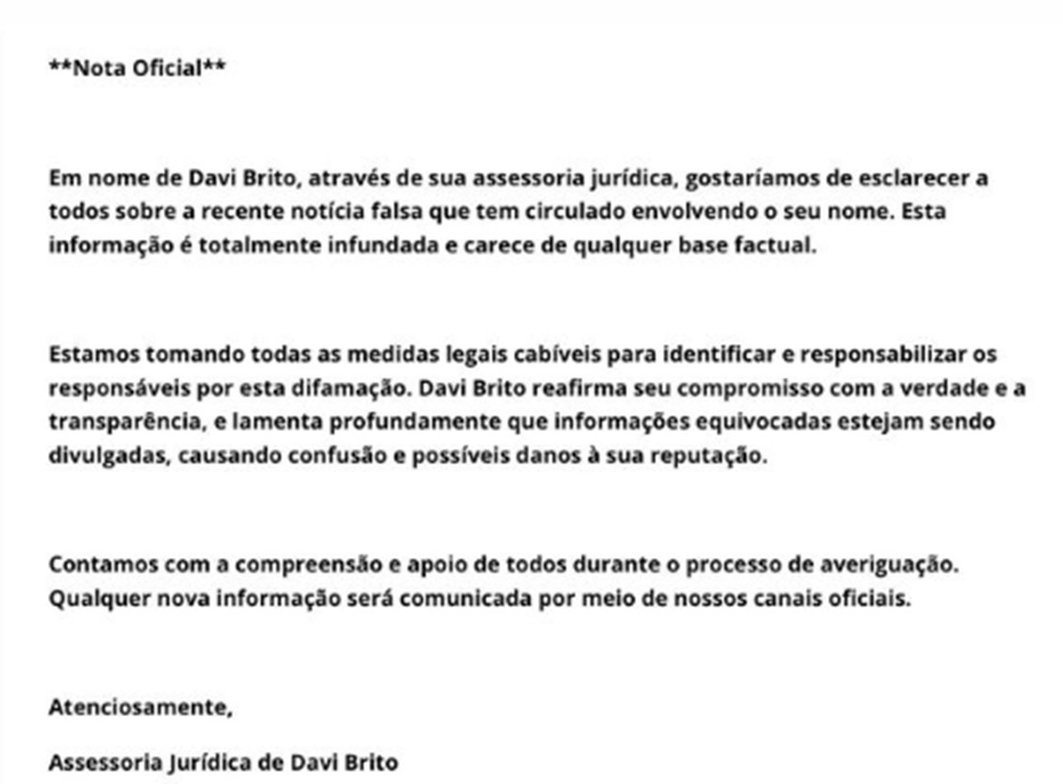 A assessoria de Davi alegou que a informação é fake news . O próprio baiano foi às redes sociais rebater a questão: "É tanta mentira que não tem nem meus dados nessa intimação [sic]". "Perseguição", completou ele.
