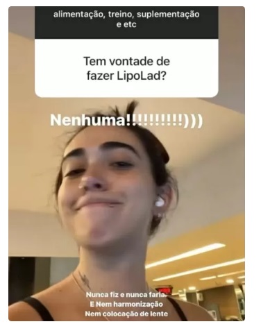 A nutricionista ainda acrescentou que não tem vontade de fazer outros procedimentos. "E nem harmonização, nem colocação de lentes".