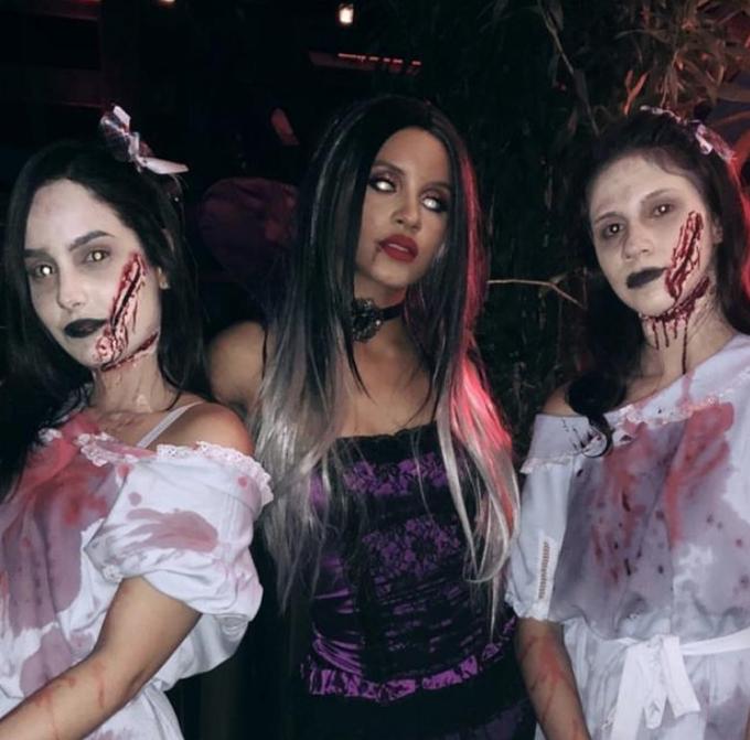 Já Gleici encarnou uma vampira fatal e assustadora, com olhos claros e peruca, ficando irreconhecível.