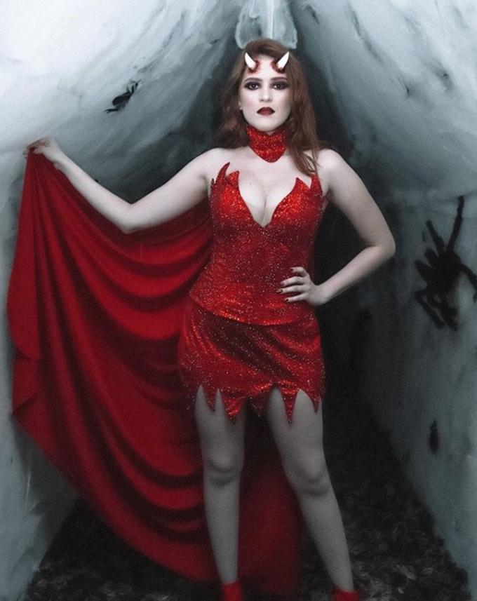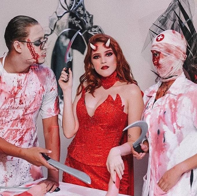 Ana Clara foi quem deu a festona com temática de Halloween, e se vestiu de 'diaba' com direito a chifres realistas na testa, e decotão.